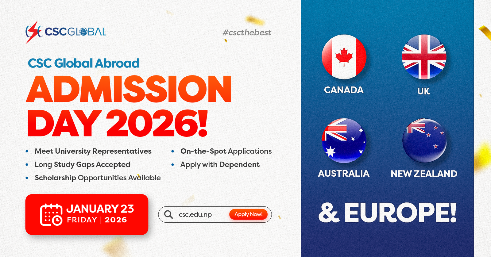 Take the next big step toward your global study dream! Join us at CSC Global Abroad Admission Day 2026 to meet university representatives and get expert guidance. Benefit from on-the-spot applications, acceptance of long study gaps, and apply with dependents.Study Destinations Covered Canada, UK, Australia, New Zealand, & EuropeContact CSC Global 📍 Kamaladi, Kathmandu 📞 9845056471 / 01-5368546 📧 info@csc.edu.np 🌐 csc.edu.np Study Destinations Covered Sweden, Denmark, Finland, Germany, Austria, Belgium, NetherlandsContact CSC Global 📍 Kamaladi, Kathmandu 📞 9845056471 / 01-5368546 📧 info@csc.edu.np