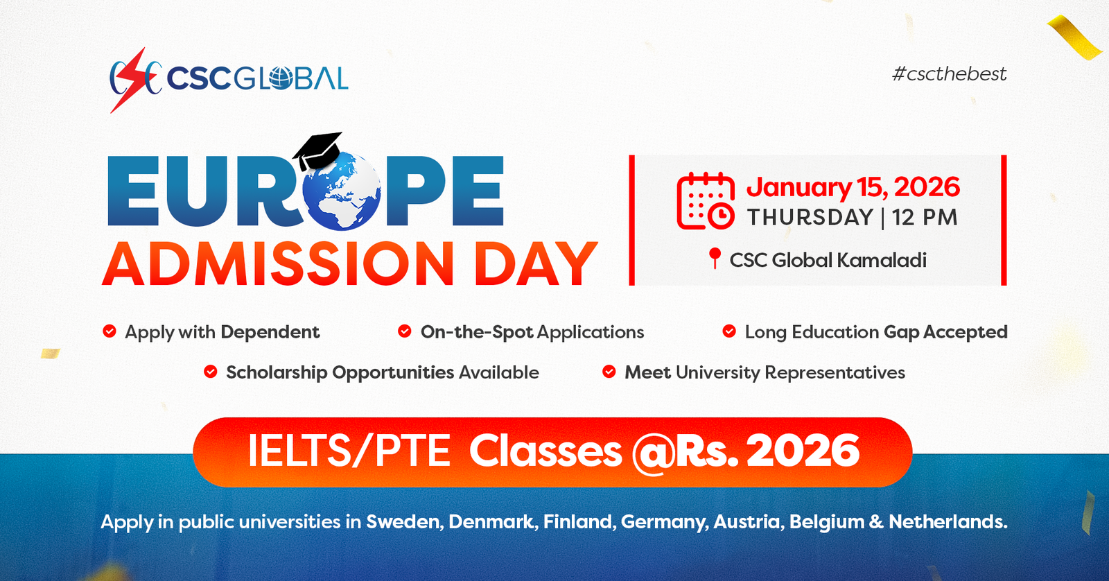 Take the next big step toward your European study dream with Europe Admission Day 2026, organized by CSC Global. This exclusive admission event is designed for students planning to study in top public universities across Europe.